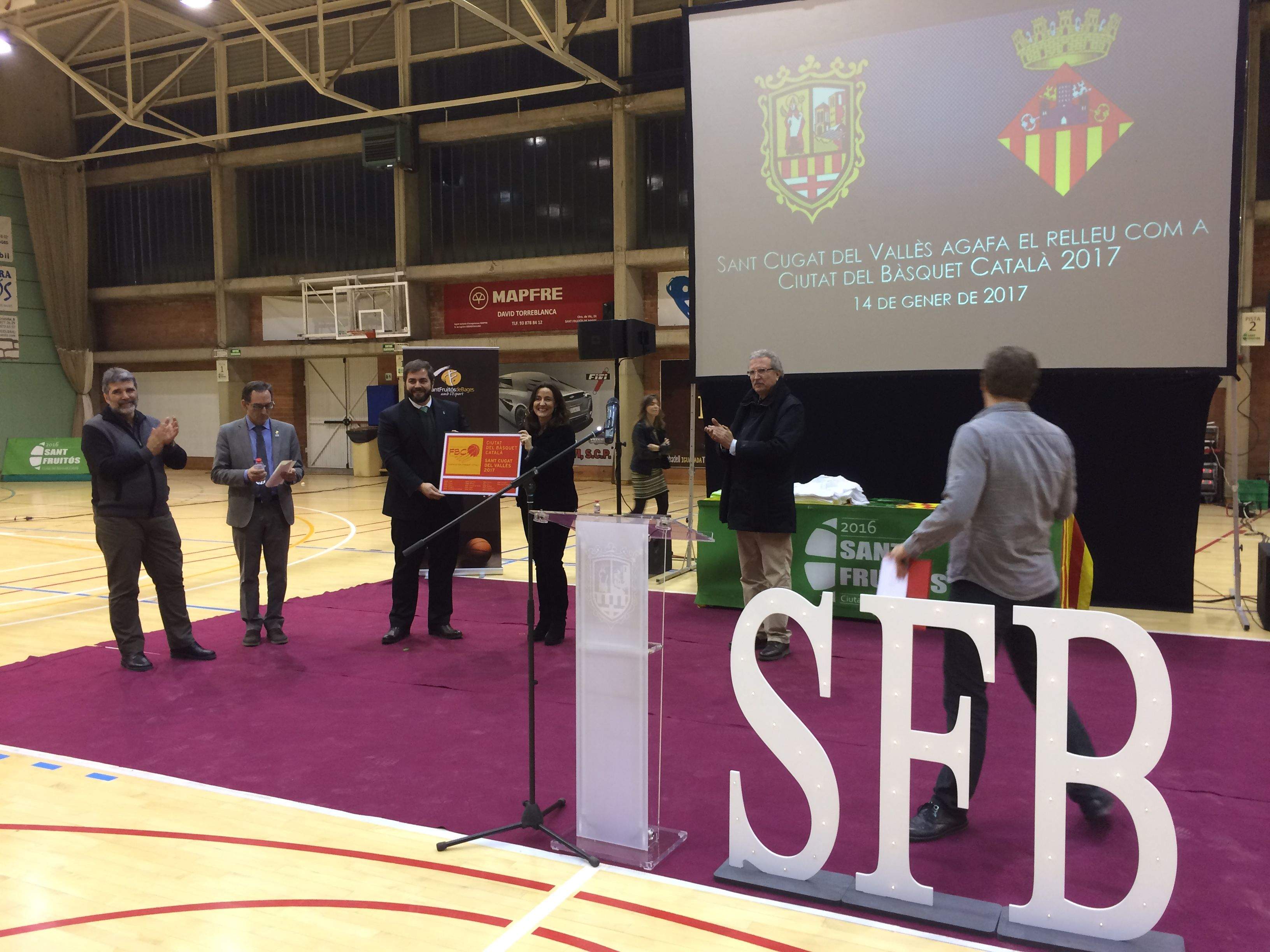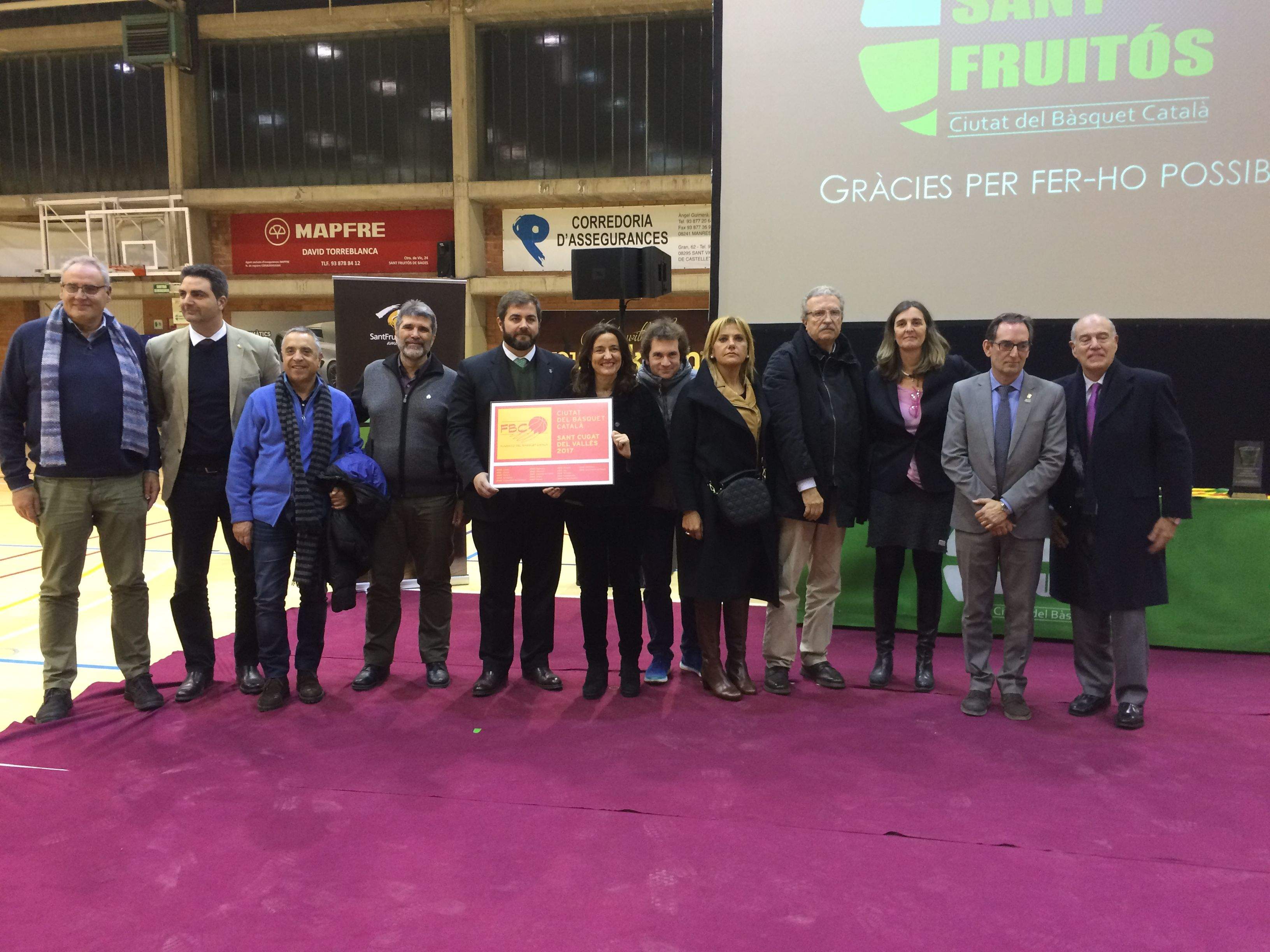Sant Cugat ja és Ciutat del Bàsquet Català 2017. Aquest dissabte, 14 de gener, a la nit, Sant Fruitós de Bages ha fet el traspàs a Sant Cugat, en un acte al pavelló municipal de Sant Fruitós de Bages, amb més d'un centenar de persones. Durant l'acte, Sant Fruitós de Bages ha lliurat a Sant Cugat el quadre que simbolitza el relleu de Ciutat del Bàsquet Català, una iniciativa de la Fundació de la Federació Catalana de Basquetbol.