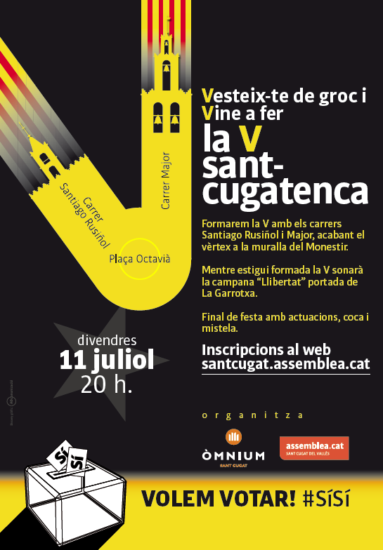 Per la seva banda, la Candidatura d'Unitat Popular (CUP) fa una crida als santcugatencs "animem al poble de Sant Cugat a participar, aquest proper 11 de juliol, a la V santcugatenca organitzada per l'ANC i Òmnium. Donem tot el nostre suport a aquesta iniciativa, i totes aquelles mobilitzacions encaminades a que el 9 de novembre puguem celebrar el referèndum i decidir, així, lliurement el nostre futur".