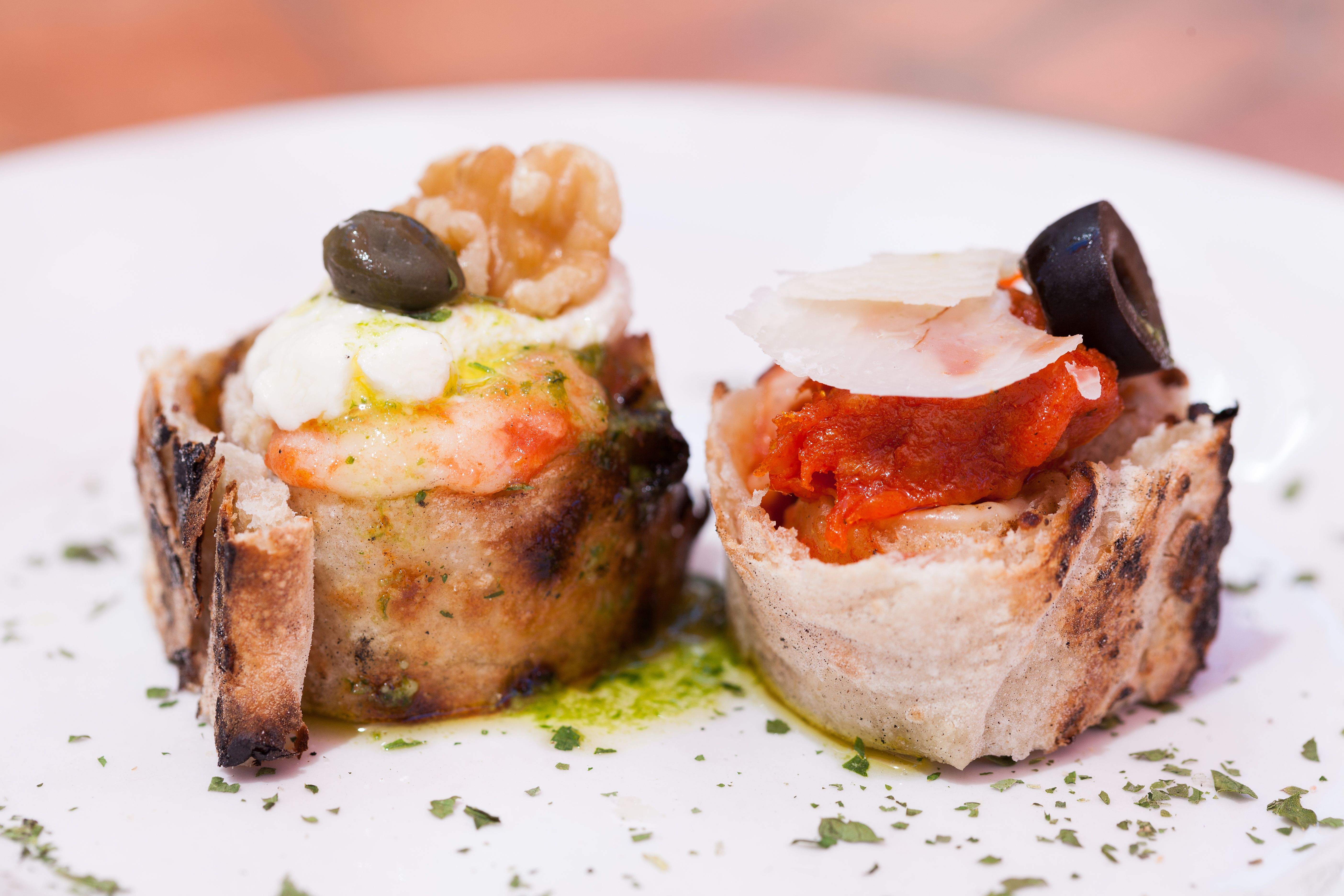 Minipizza amb formatge provolone trufat i pernil ibèric.