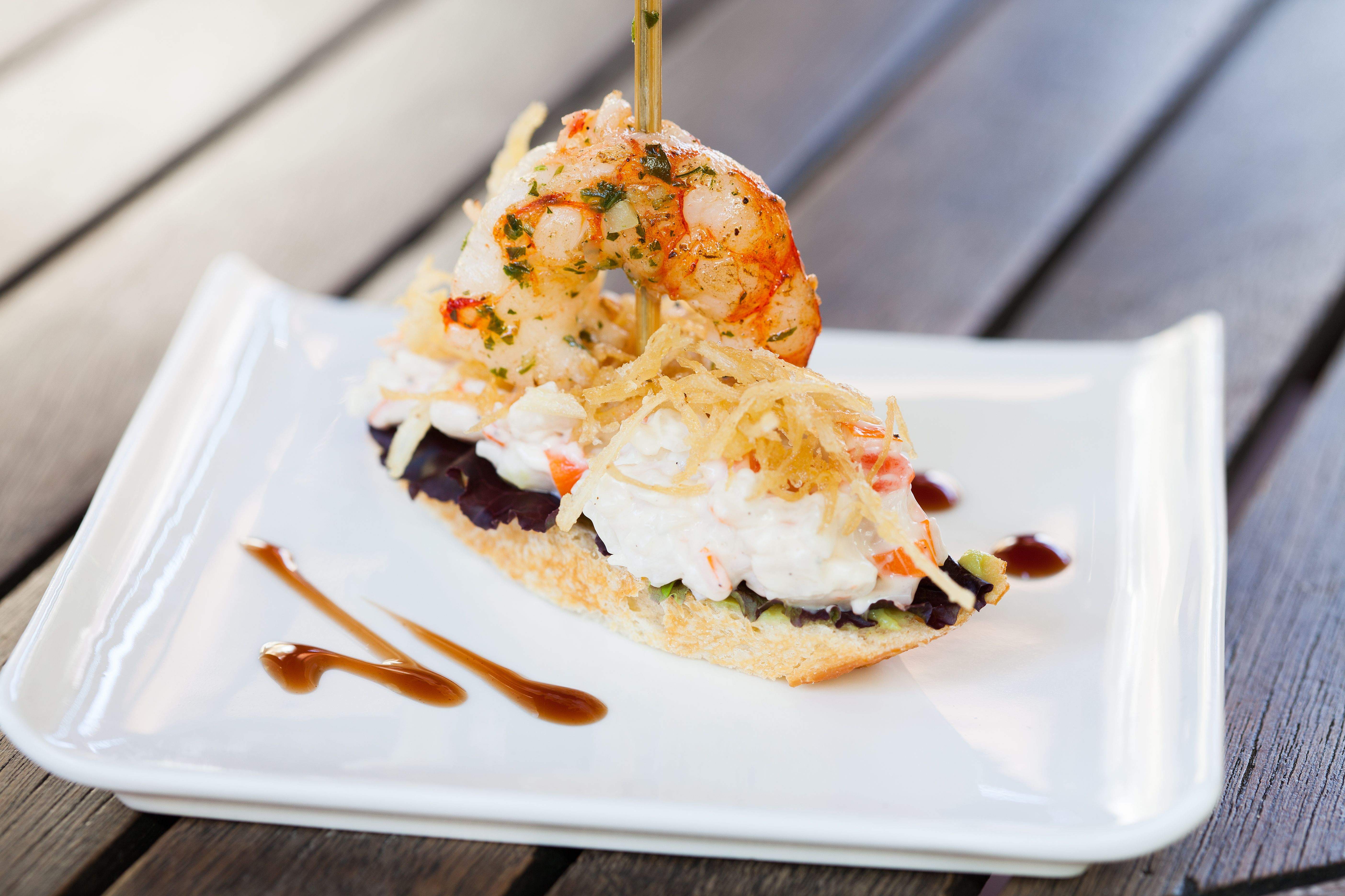 Sobre una torrada, cremós d’alvocat amb mesclum, amanideta de cranc, salmó i llagostins amb cruixent de porro.