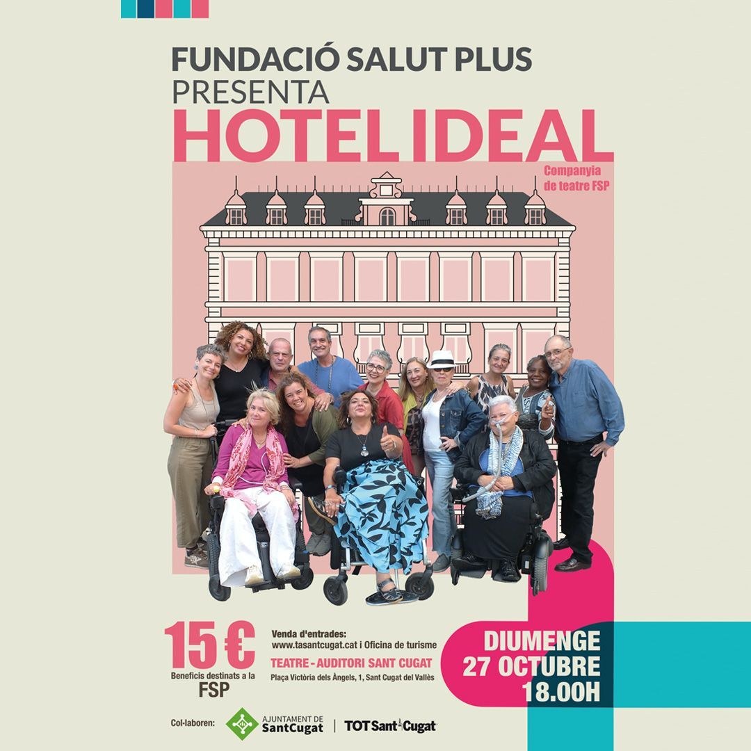 La representació d'Hotel Ideal arriba al Teatre-Auditori de Sant Cugat de la mà de la Fundació Salut Plus per a l'atenció psicosocial a la persona amb malaties cròniques. Hotel Ideal tindrà lloc el diumenge 27 d'octubre a les 18.00 hores amb l'objectiu de transmetre l'humor, la passió i la reivindicació dels actors i d'expressar valors com l'amistat.