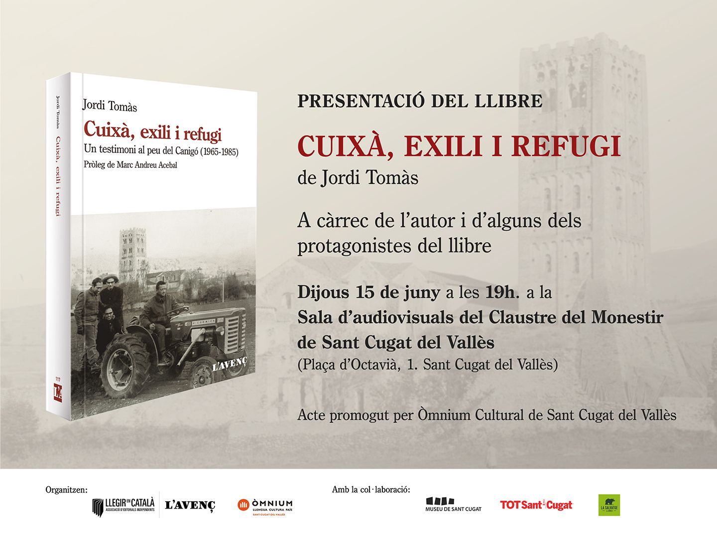 Vuit monjos expulsats de Montserrat i enviats al monestir de Sant Miquel de Cuixà, al Confient, són els protagonistes de Cuixà, exili i refugi. Un testimoni al peu del Canigó (1965-1985), un assaig de l’antropòleg i escriptor Jordi Tomàs. El dijous 15 de juny Òmnium Sant Cugat presenta el llibre a les 19 h Sala d’audiovisuals del claustre del Monestir de Sant Cugat i hi assistiran l’autor i alguns dels protagonistes dels fets que exposa el llibre.