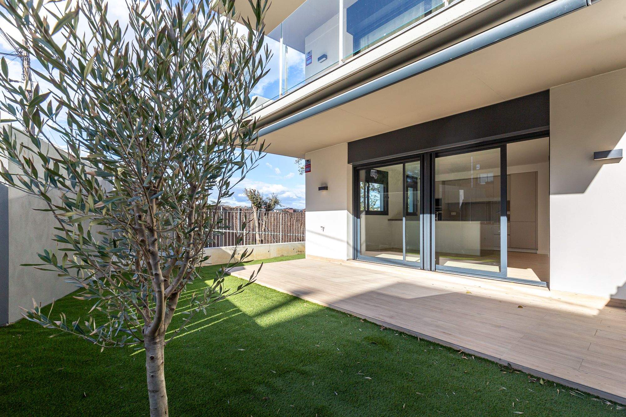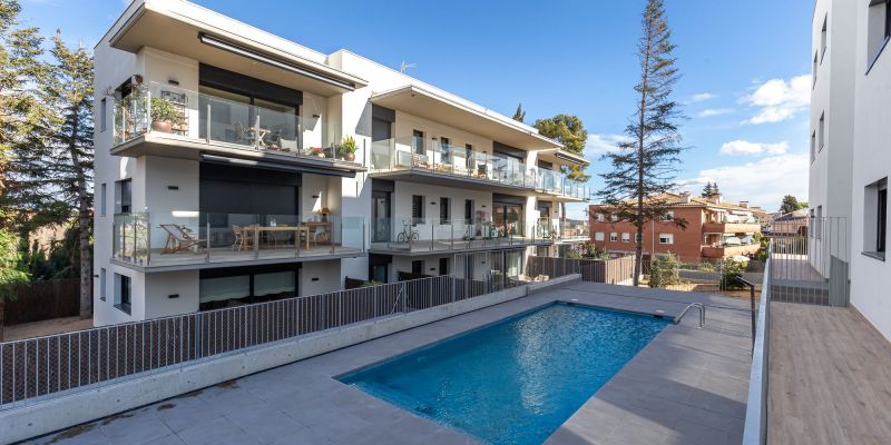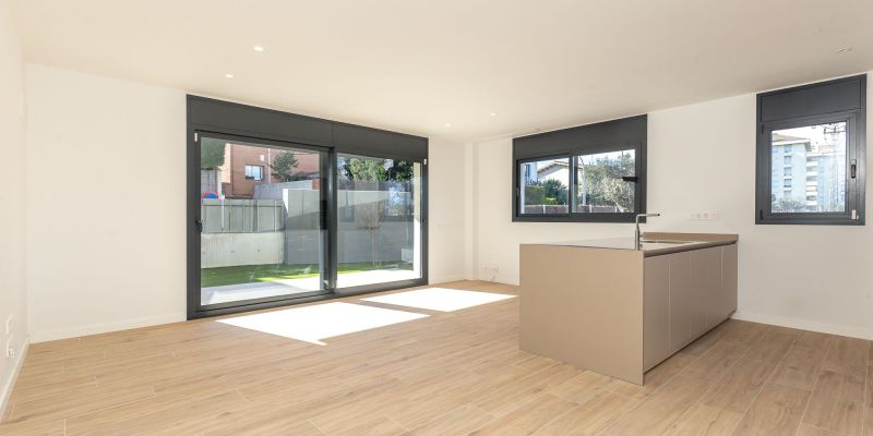L'habitatge, de 95 m², es distribueix en zona de dia i nit. A la primera, trobem un ampli saló menjador amb cuina integrada amb illa, equipada amb cuina Santos i electrodomèstics Siemens, tot per estrenar. Inclou els rentavaixelles i la nevera integrats al mobiliari de cuina. Des de la sala d'estar tenim accés al jardí privat, amb orientació sud/est, que envolta tot el pis, i disposa de tendals automatitzats.
