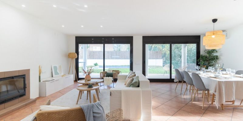 Es distribueix en 3 plantes i a la planta baixa trobem un ampli i espaiós vestíbul d'entrada que ens condueix a un espectacular saló-menjador que gràcies als seus grans finestrals ens permet sortir a l'espai exterior amb vista a la piscina i jardí.