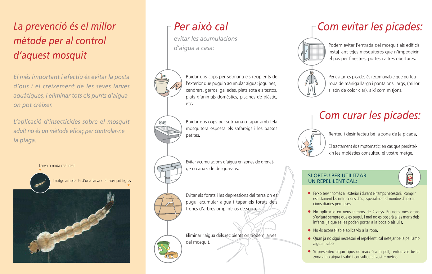 Sigui per evitar possibles riscos o per estalviar-nos los molestes i contínues picades, hi ha un seguit d'accions que podem fer per reduir la presència del mosquit tigre a casa nostra. La premissa és clara: els mosquits necessiten aigua per criar. Per tant, hem de fer tot el possible per evitar acumulacions d'aigua als jardins o terrasses. "N’hi ha prou amb una galleda perquè criïn milers de mosquits i molestin tot els veïns del carrer", alerta Eritja, que demana una major sensibilització per part de la ciutadania. Cal buscar i eliminar els recipients amb aigua, tan senzill i tan difícil com això. "És complicat perquè la gent no sempre reacciona. A més, les larves del mosquit són com capgrossos i no són fàcils de reconèixer".