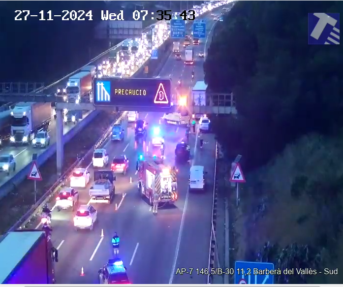 Matí molt complicat a l'AP-7 amb cues quilomètriques. Un accident a les set del matí d'aquest dimecres a Barberà i el posterior incendi d'un dels vehicles implicats ha obligat a tallar la via en direcció Tarragona i ha provocat un col·lapse total en els dos sentits de la marxa. Tot i que tots els carrils han quedat oberts poc després i que la incidència no afectava inicialment Sant Cugat, s'han generat retencions quilomètriques en sentit Girona amb un col·lapse general a tota la via. S'han arribat a generar gairebé vint quilòmetres de cues en els dos sentits, entre Castellbisbal i Barberà i entre Granollers i Barberà.