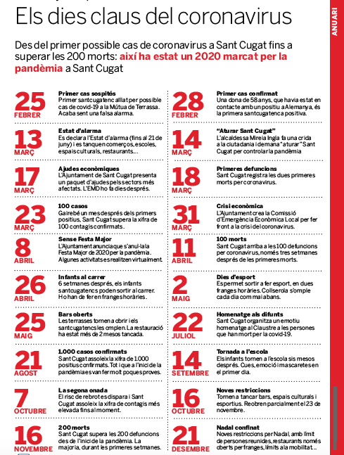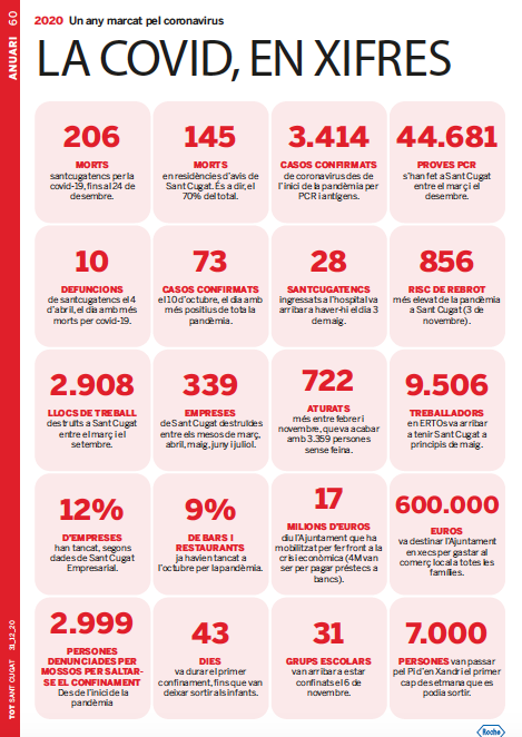 Hem estat setmanes confinats sense poder sortir de casa i els infants van estar quatre mesos sense anar a l’escola. Comerços i restauració han estat molts períodes amb les persianes baixades. La nostra vida ha canviat de manera radical. I les conseqüències per l’economia santcugatenca encara s’estan agreujant amb el tancament d’empreses, la pèrdua de llocs de treball i l’increment de l’atur. El 2020 serà un any que mai oblidarem.