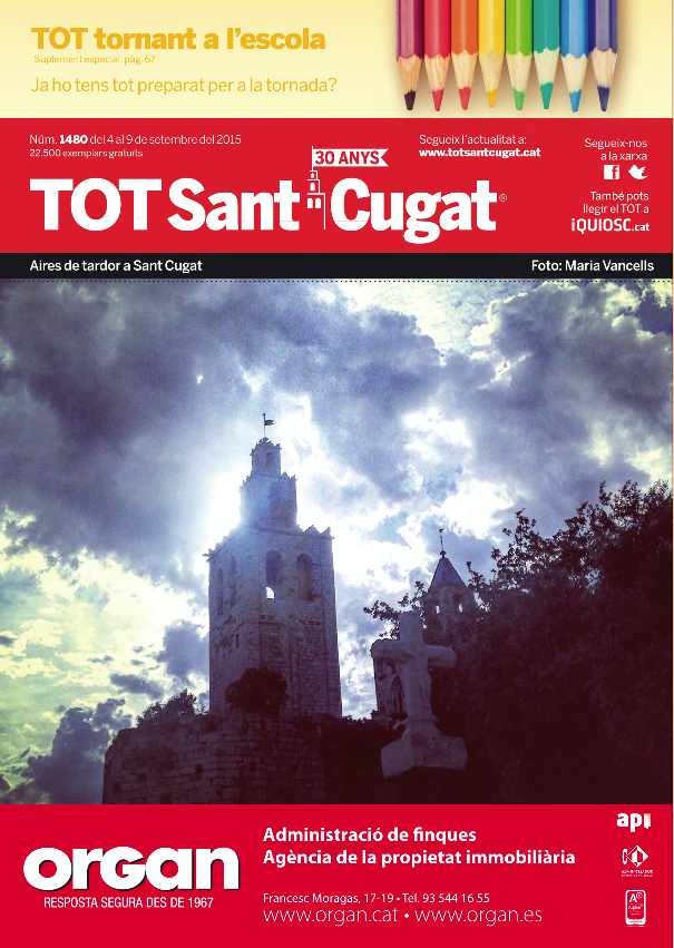 La foto de la nostra portada està relacionada amb el temps d’aquests darrers dies a Sant Cugat: cels ennuvolats, pluja i baixada de temperatures... amb un cert aire de tardor, oi? Una imatge captada en realitat algunes setmanes abans per la santcugatenca Maria Vancells.