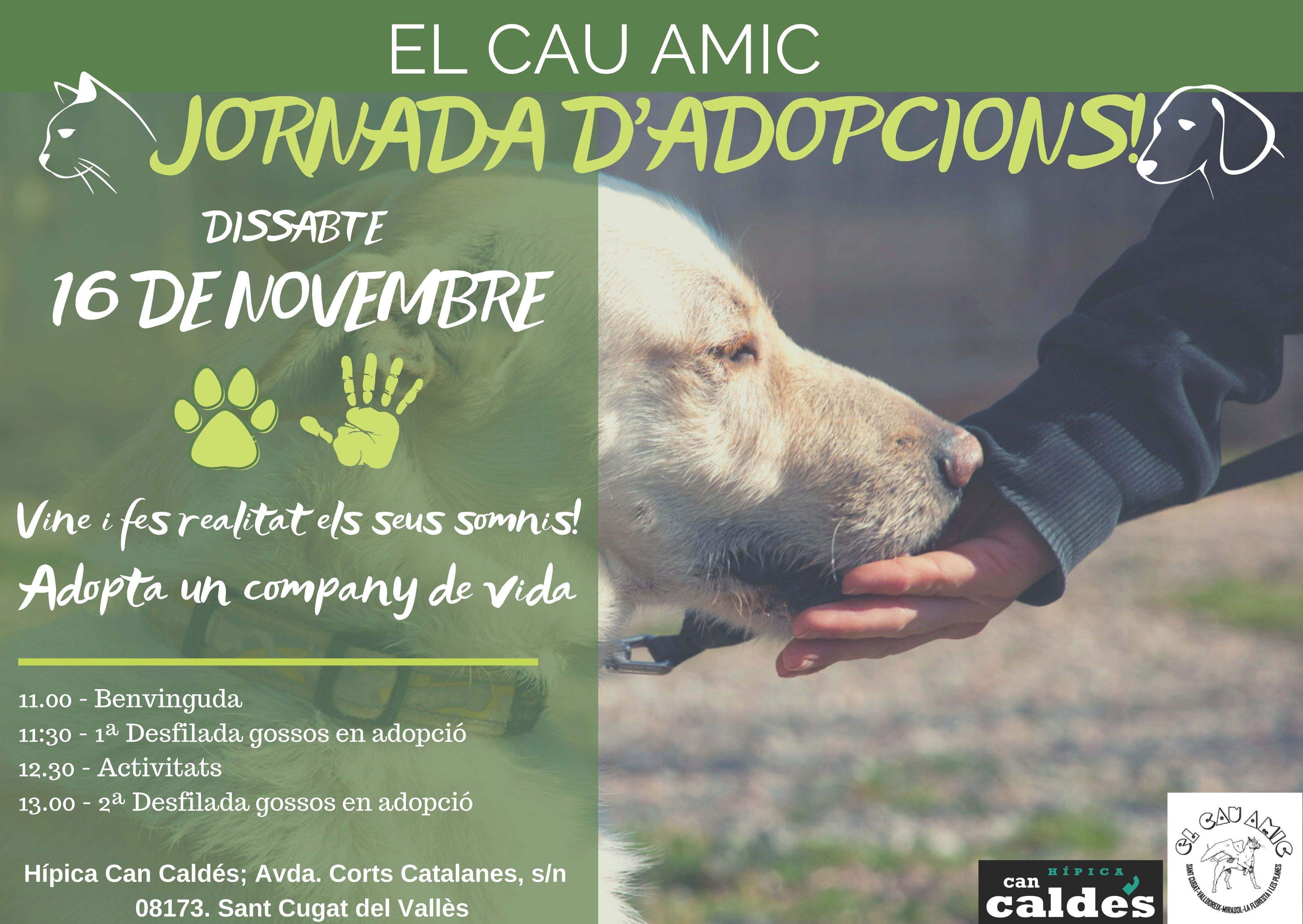 L'associació Cau Amic organitza una nova jornada d'adopcions de gossos, el dissabte 16 de novembre, a l'Hípica de Can Caldés de Sant Cugat, a partir de les 11 h del matí. Per això, hi haurà dues desfilades de gossos, amb l'objectiu de trobar famílies que puguin adoptar als animals i poder "fer realitat els seus somnis".