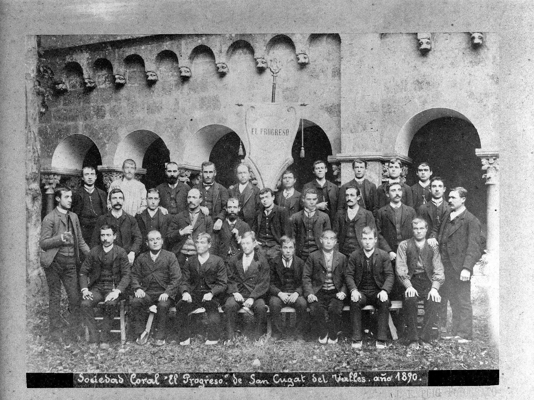 La segona imatge (Col·lecció Rogeli Pedró. Josep Esplugas Puig. AMSCV. 1890) és una foto de grup de la Societat Coral El Progreso, presa al Claustre del Monestir. Hi ha una trentena de cantaires, tot homes.