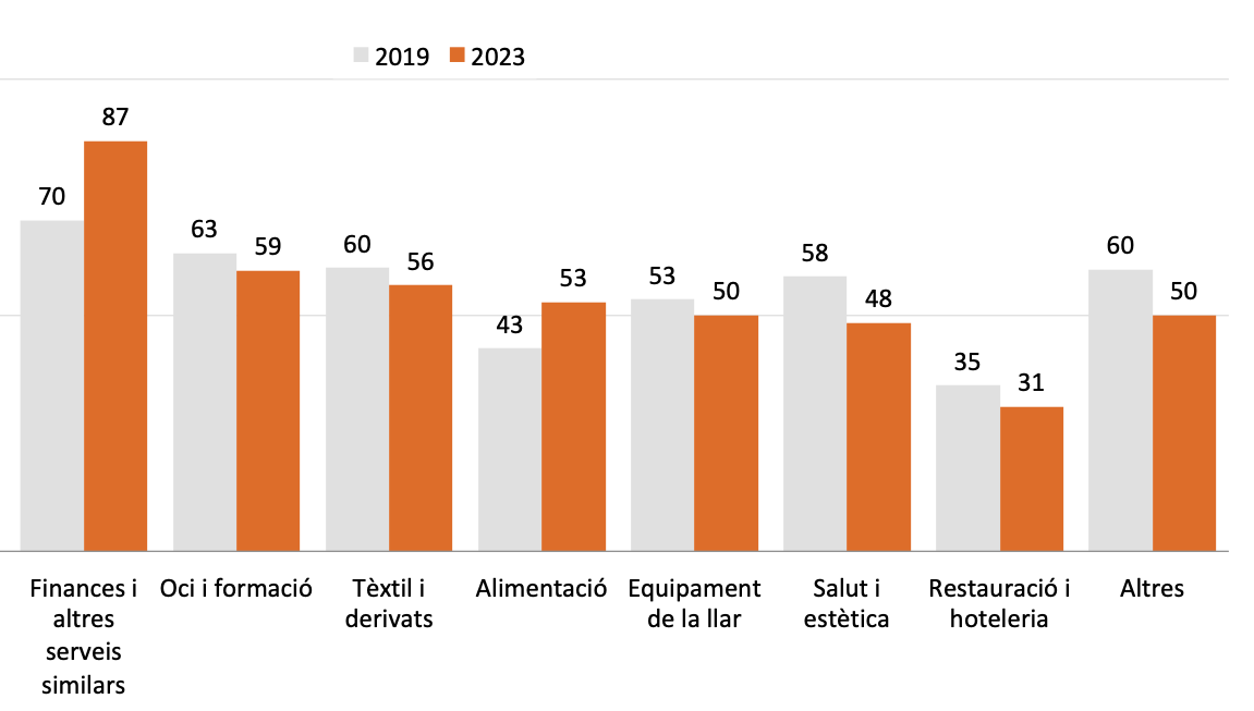 El sector de les finances i serveis similars és on més s'utilitza el català en la salutació inicial (87 sobre 100). En canvi, en el cas de la restauració i l'hostaleria cau fins als 31 punts i és el sector amb menys ús del català. "És el sector on caldria actuar més", analitza Albert Fabà.