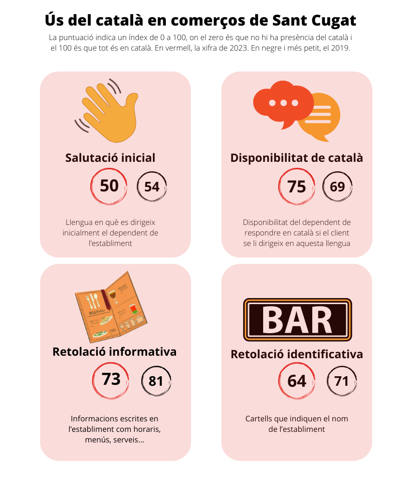 L'ús del català en la salutació inicial ha caigut quatre punts respecte a l'estudi de 2019, quan l'índex se situava en el 54. La part positiva és que la disponibilitat a contestar en català ha augmentat, passant de 69 a 75 punts. En la retolació identificativa l'índex d'ús del català ha baixat de 71 a 64 punts, mentre que en la retolació informativa ha caigut de 81 a 73.