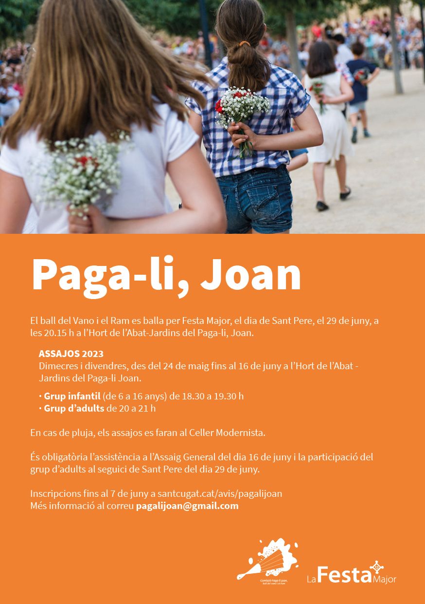 Els assajos del Paga-li, Joan per la Festa Major 2023 començaran el dimecres, 24 de maig. El ball del Vano i el Ram es fan cada any per Festa Major, el dia de Sant Pere, el 29 de juny, a les 20.15 h a l'Hort de l'Abat - Jardins del 'Paga-li, Joan'.
